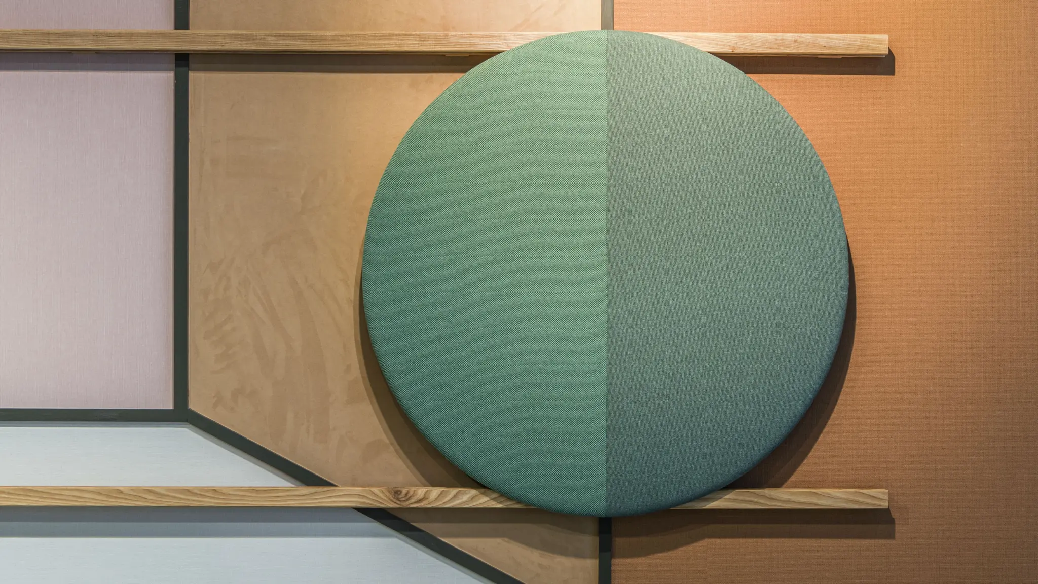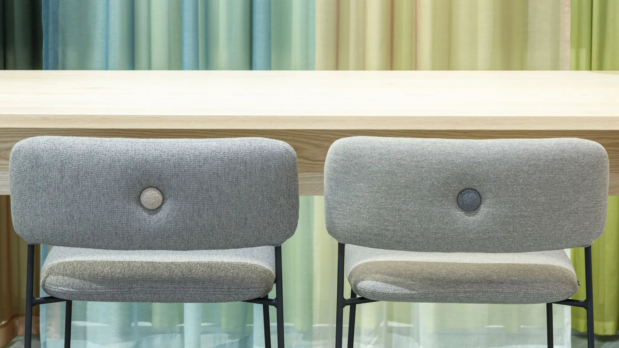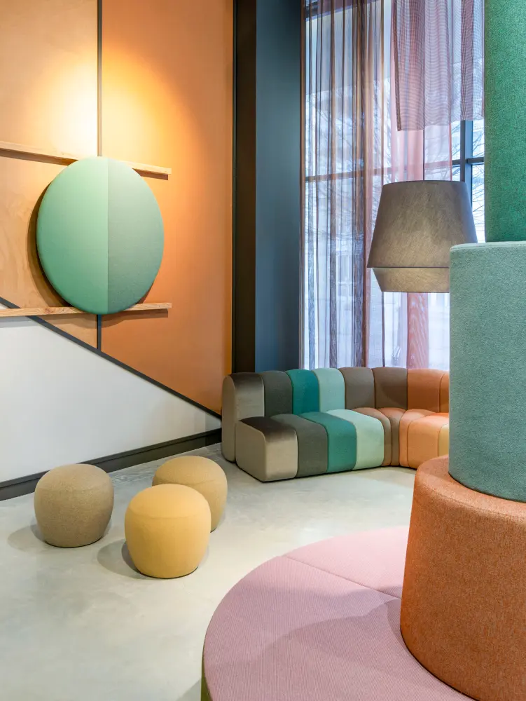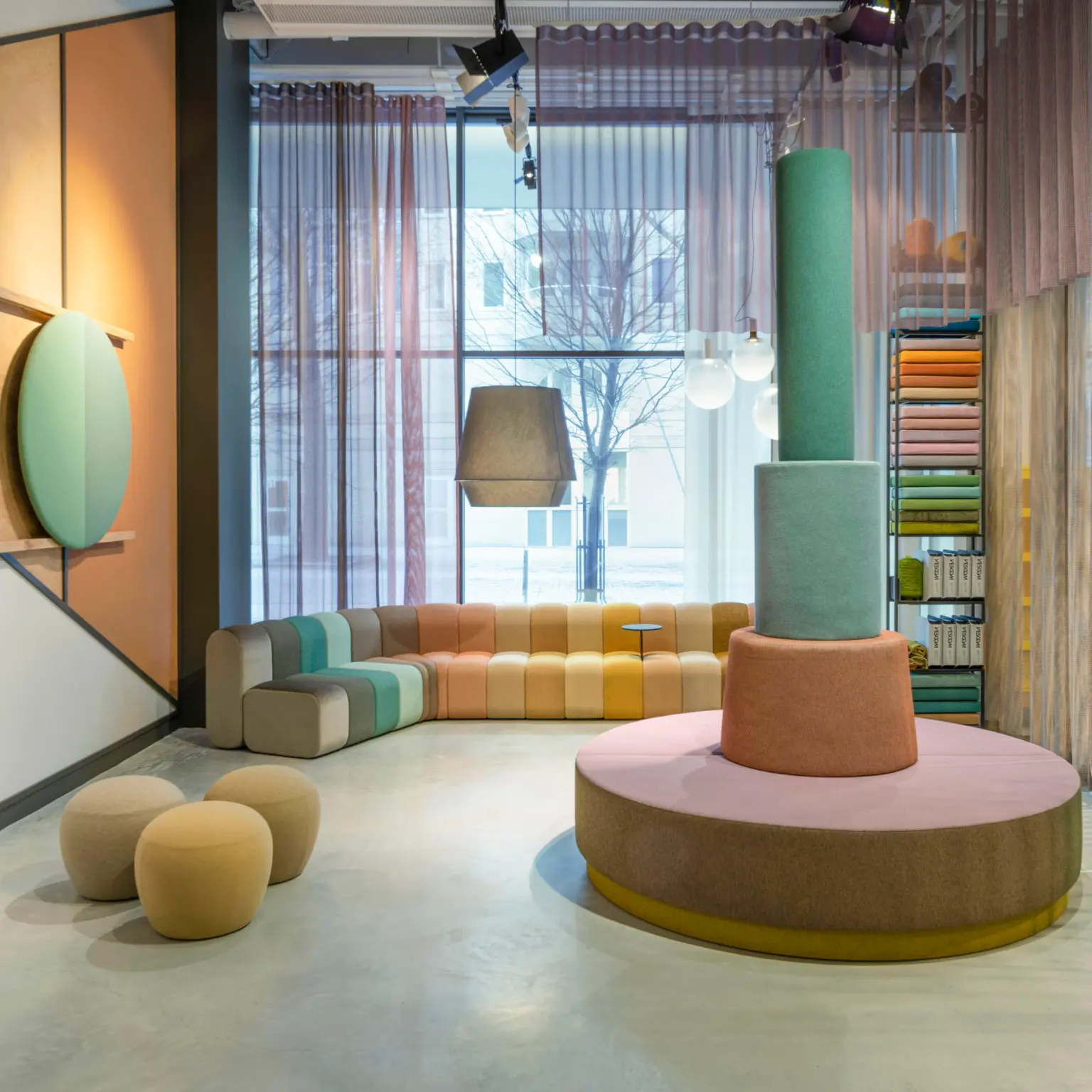Van Tol treated the space like a stage set, making the architects and designers the performers. They can take a seat at a workstation, comfortably taking their time to browse through Vescom’s materials and make selections. They can connect with clients and partners in a design-focused setting to be inspired by the solutions on show. ‘Vescom’s “material lab” is a meeting place for professionals who work with textiles and wallcovering for all kinds of contract environments,’ says Janne Wetterlind, managing director of Vescom Scandinavia. ‘Here you can sit down, be inspired and play with all kinds of coordinated materials and colours, and immediately see a project come together. The whole idea is about simplicity and ease.’