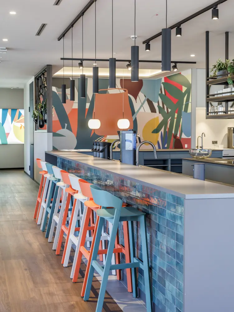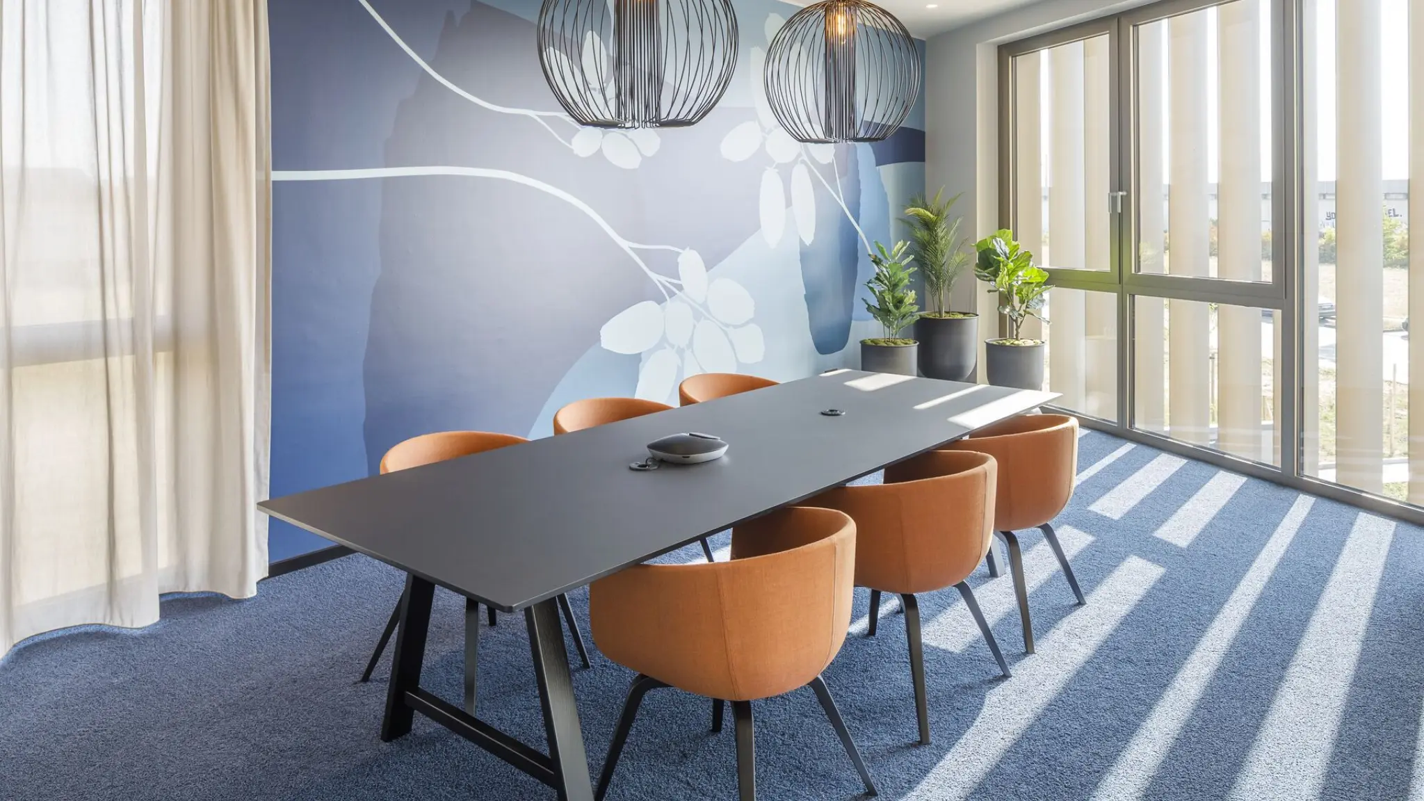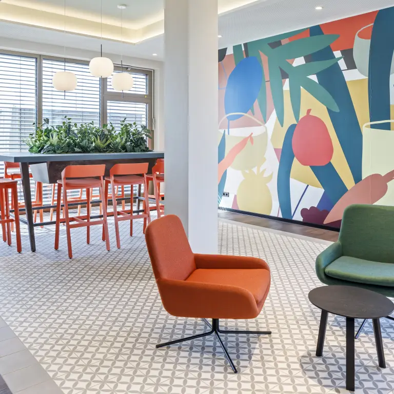 Customized digital printed colourful wallcovering creates a cosy office atmosphere