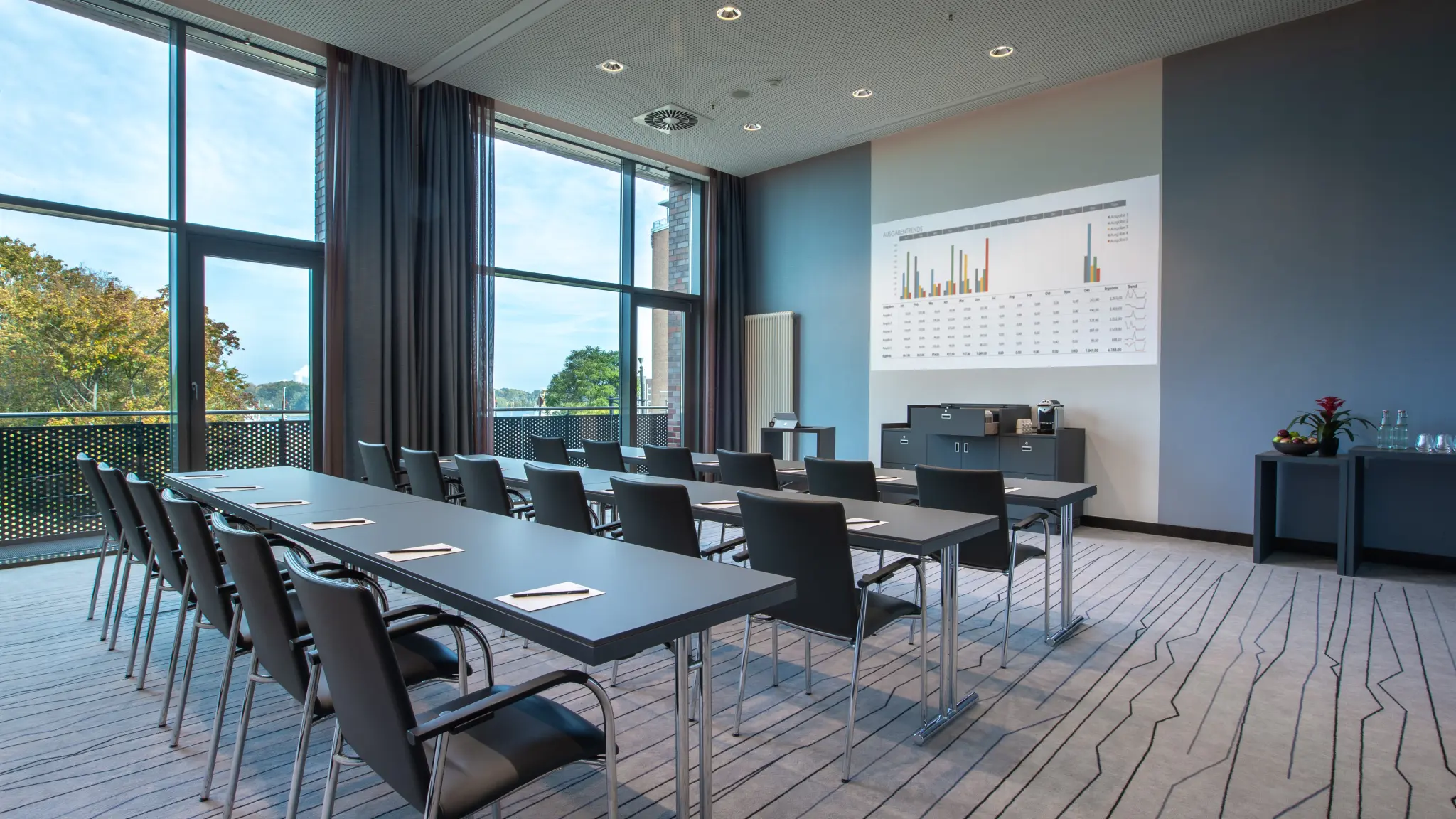 In the lobby, the lift corridors and the rooftop bar entrance, the striking 3D design Shannon sets accents, while the reflective triangles by Aikin give the rooftop bar a hip and modern touch. The architects designed the walls of the conference rooms with the Florence silk look and integrated the whiteboard wallcovering Matte-rite, which can be used as a projection surface and for dry erase writing.