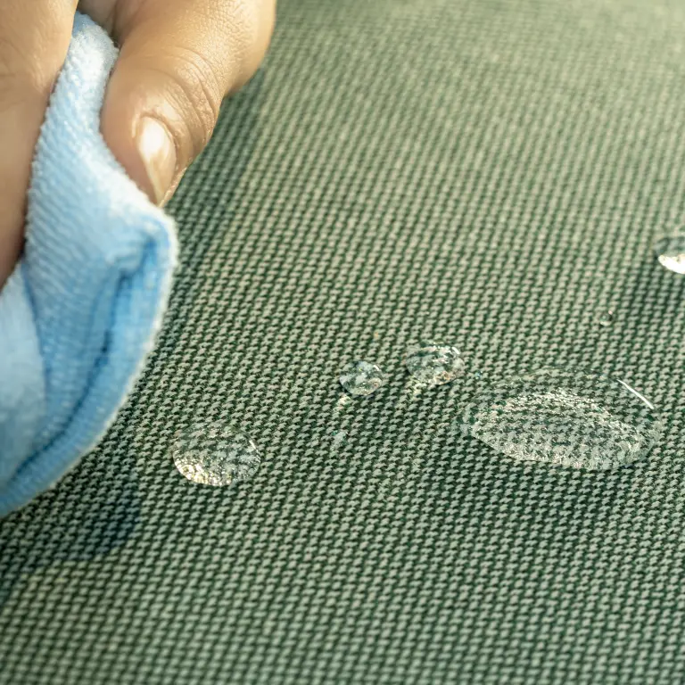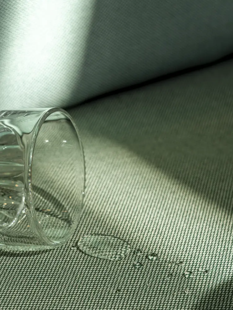 Clint resists water-based liquids thanks to a hydrophobic finish. Enveloping the yarn, this protective layer creates a barrier that keeps spills on the surface temporarily, allowing for quick and easy cleaning.